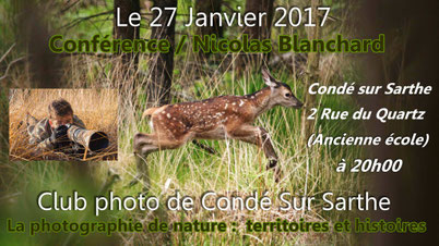 Vendredi 27 Janvier prochain à 20h00 je suis invité par le club photo de Condé sur Sarthe, pour vous présenter mes photographies en vous racontant les histoires qui se cache derrière ! Photographiant principalement dans le massif d'Ecouves et dans le parc Normandie-Maine je vous parlerai de la faune et de la flore sauvage. Marqué au cours de mon cursus par l'ouvrage "les animaux ont une histoire" de Robert Delord, j'essaie depuis de lier Histoire et Nature par le prisme de la photographie, notamment dans mon travail sur le peintre Georges Lacombe (1868-1916)