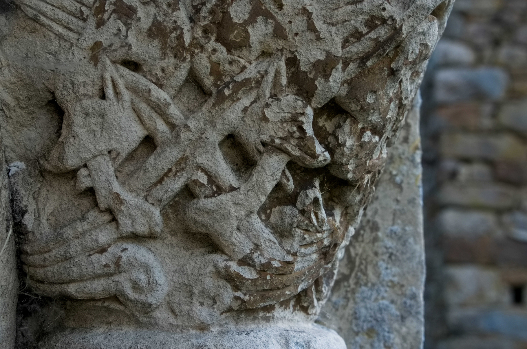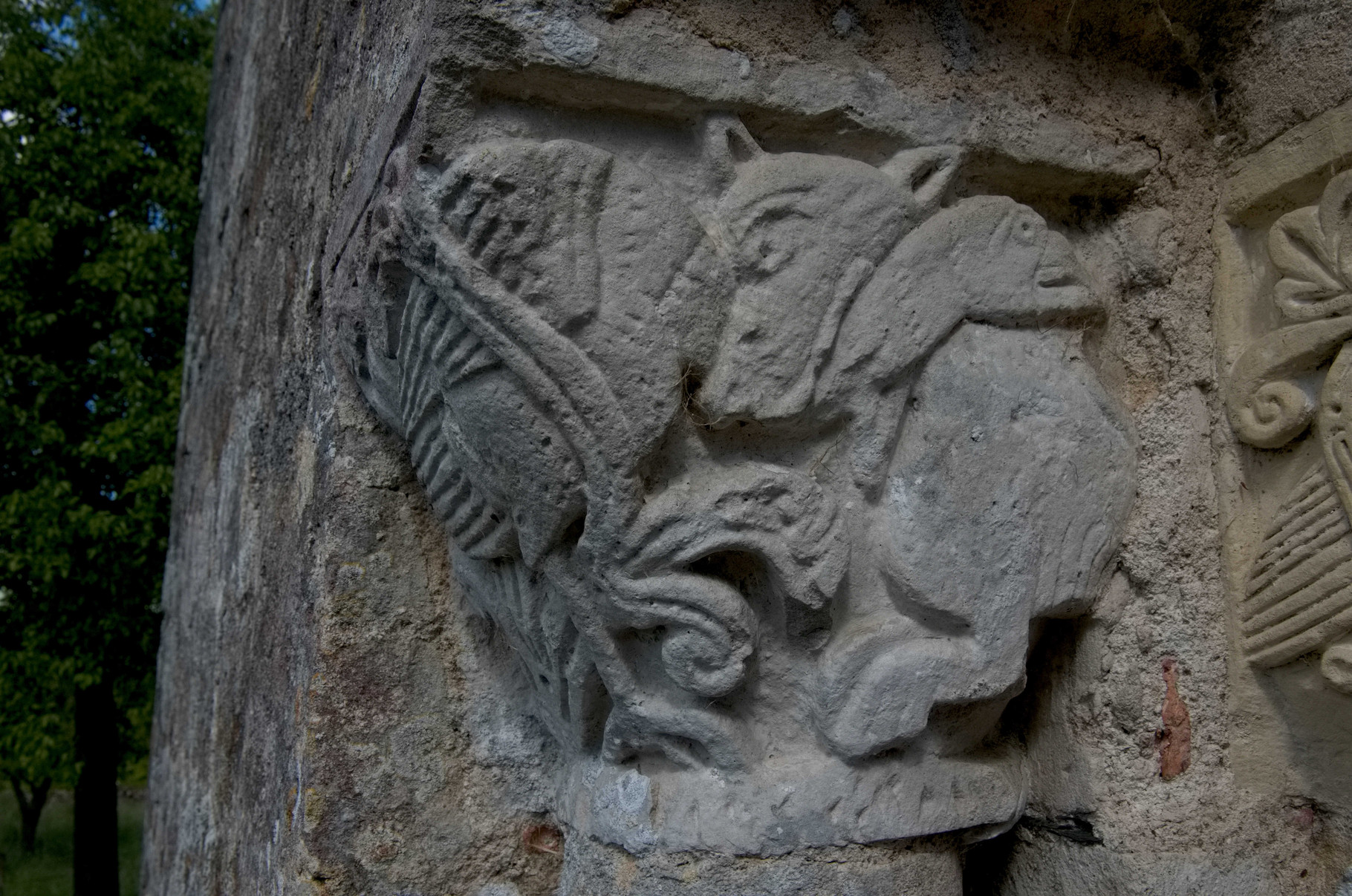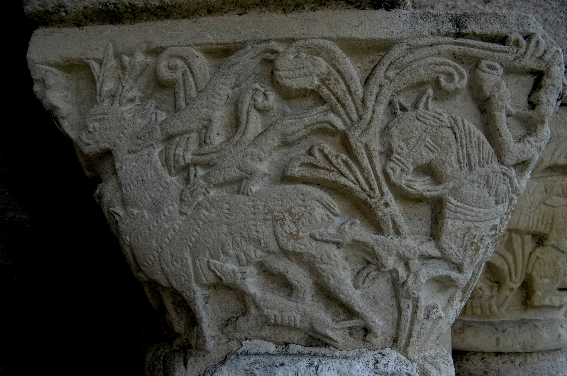 Si l’on prête attention aux autres chapiteaux on s’aperçoit qu’il s’agit de scènes de chasses, de motifs végétal ou encore d’animaux divers mais très commun : oies, renard, ou encore deux lions léopardisés/léopards lionnisés.