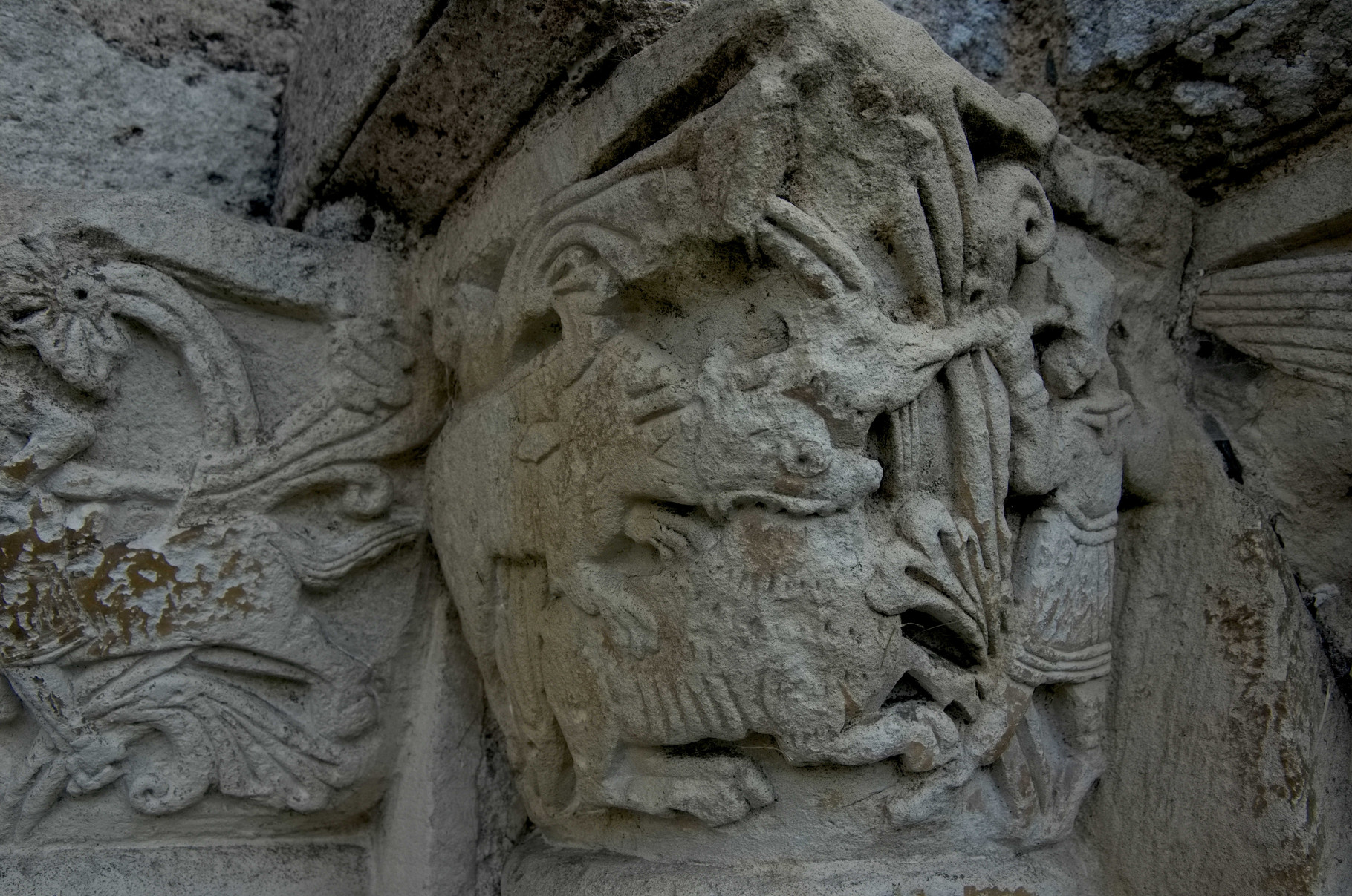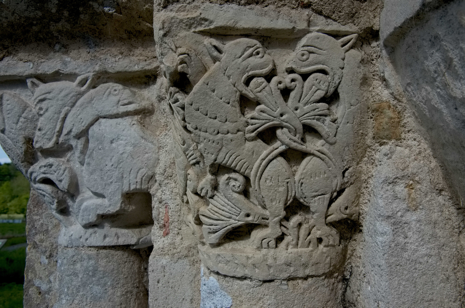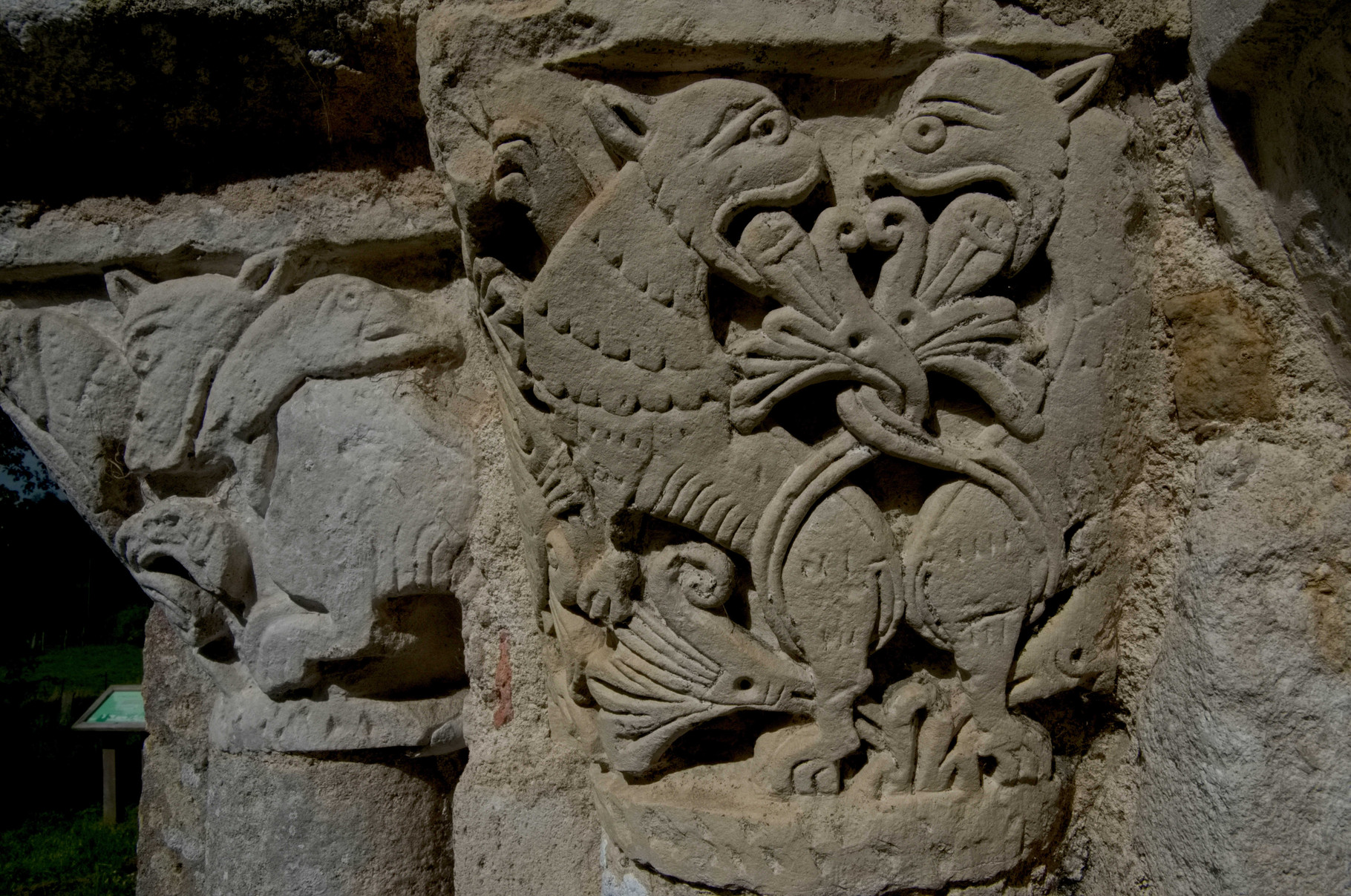 Si l’on prête attention aux autres chapiteaux on s’aperçoit qu’il s’agit de scènes de chasses, de motifs végétal ou encore d’animaux divers mais très commun : oies, renard, ou encore deux lions léopardisés/léopards lionnisés.