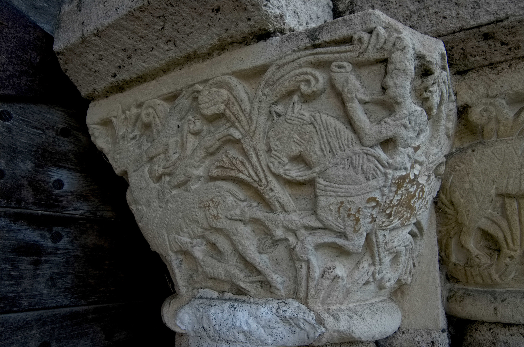L’un des chapiteaux retiendra plus particulièrement notre attention. Celui-ci représente un homme poursuivant... un loup s’attaquant à une brebis ! On notera la symbolique de la brebis égarée, qui faute de suivre le troupeau se voit attaquée par le loup, suppôt du diable du bestiaire médiéval.